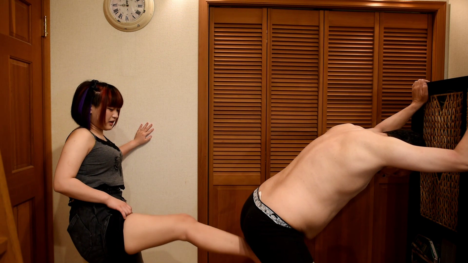 Milk starts off by kicking him in the balls and keeps saying (in Japanese) that she isn’t kicking hard. He frequently falls to the floor after loud slapping noises between her foot and his groin. She then has him turn around and kicks him from behind a few times before kicking him from the front once more. She then has him stand against the wall while she sits on the floor and punches and squeezes his cock and balls. Milk then ties him to the bed with rope so he can’t move his hands or legs (sorry the part where she ties him isn’t part of the video). She then kneels between his legs and continues punching and squeezing his groin. She also briefly pushes her foot into his cock and balls. Milk then decides to tie the middle of his legs down too (this part is filmed) so he can’t wiggle as much. She then goes back to crushing his groin with her feet and kicks him a number of times before more punching and squeezing. She then lowers his underwear and slaps and squeezes his temporarily exposed cock and balls. She also uses the band of his underwear to slap his balls. She then puts his underwear back and stands up and kicks him a number of times.