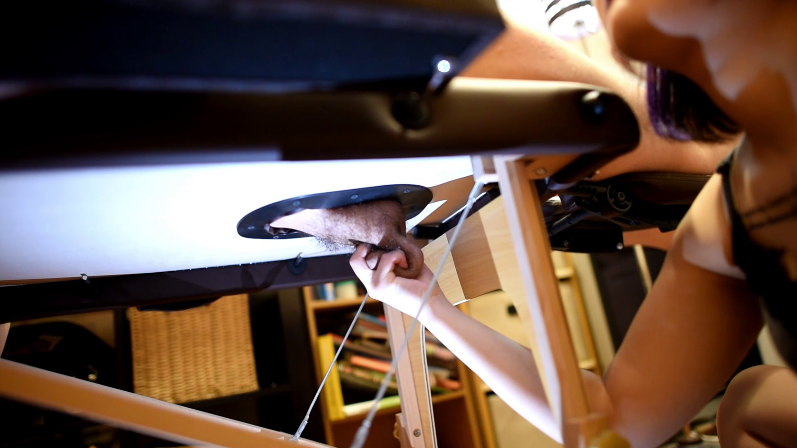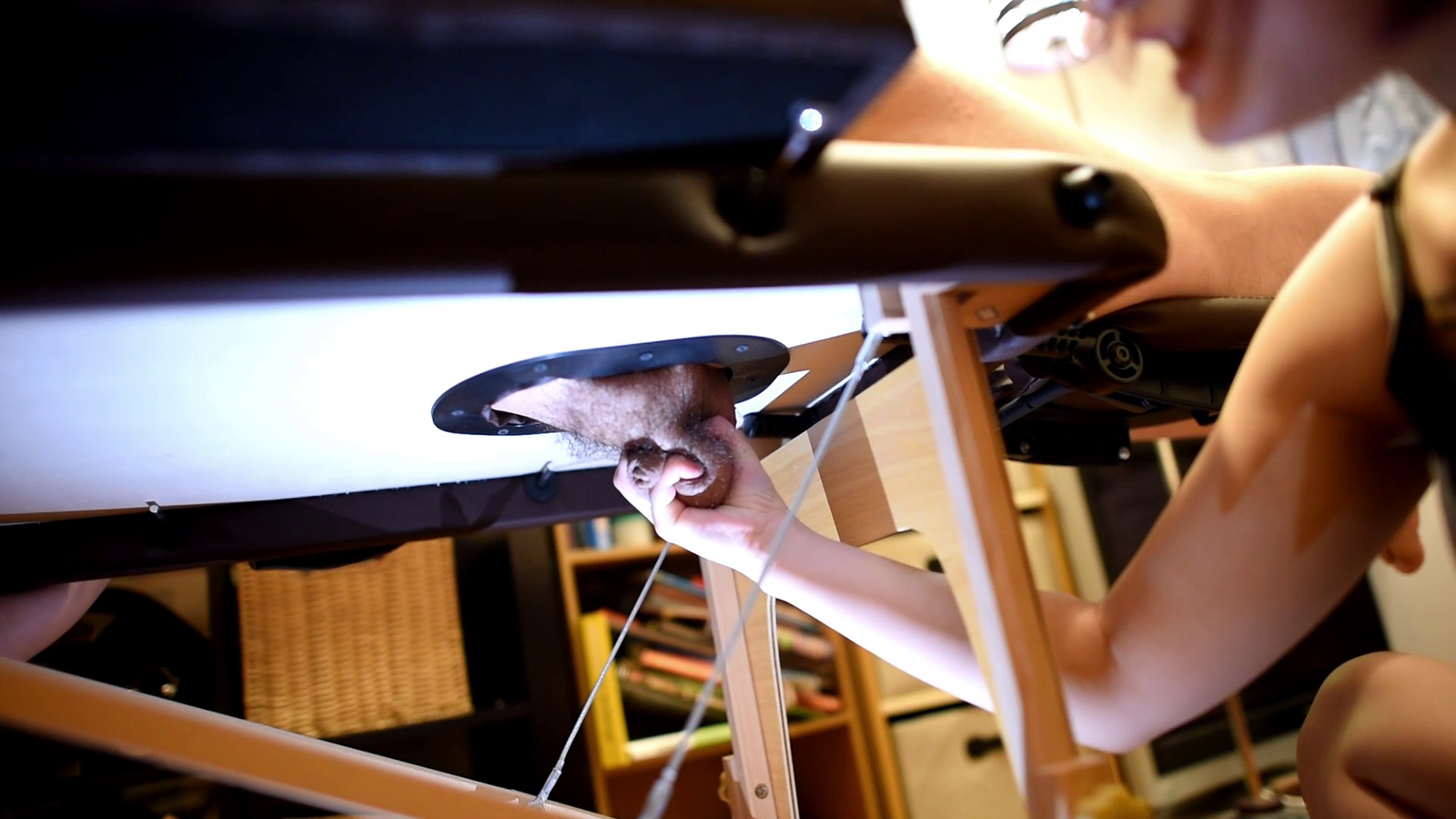 Once the rope is removed, after having him remove his underwear, Milk stands above him and puts her entire weight on his groin with her feet as she stands over him and briefly uses her knee too. She then sits down and starts squeezing his balls and crushed cock. Milk then has him stand with his legs open as she swings a tied weight into his groin from behind. After doing this for a while, she has him stand to face her and continues using it to hit his cock and balls. Milk then lies down and gently fondles his cock and balls with her foot before holding his hands and lifting him up in the hair with her feet to crush his cock and balls into his body. She does this three times and then has him on all fours on the bed while she reaches to squeeze his cock and balls with her hands in a motion similar to milking a cow. She then has him stand in front of her as she kicks him in the balls a number of times. Milk then has him lie on a massage bench with his cock and balls placed in a hole for someone’s face. She sits on the floor and reaches and squeezes his groin. Milk then finally has him ejaculate inside himself with her knee as he puts his body weight into it.